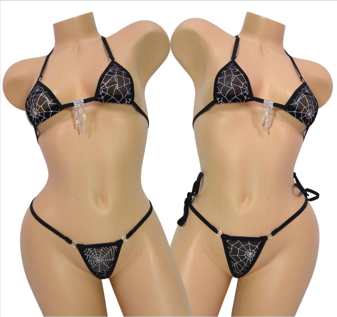 This extremely sexy bikini is made using a black mesh that has a spiderweb design in silver foil and is trimmed in black. For that extra sparkle there is a dangly rhinestone between the cups.