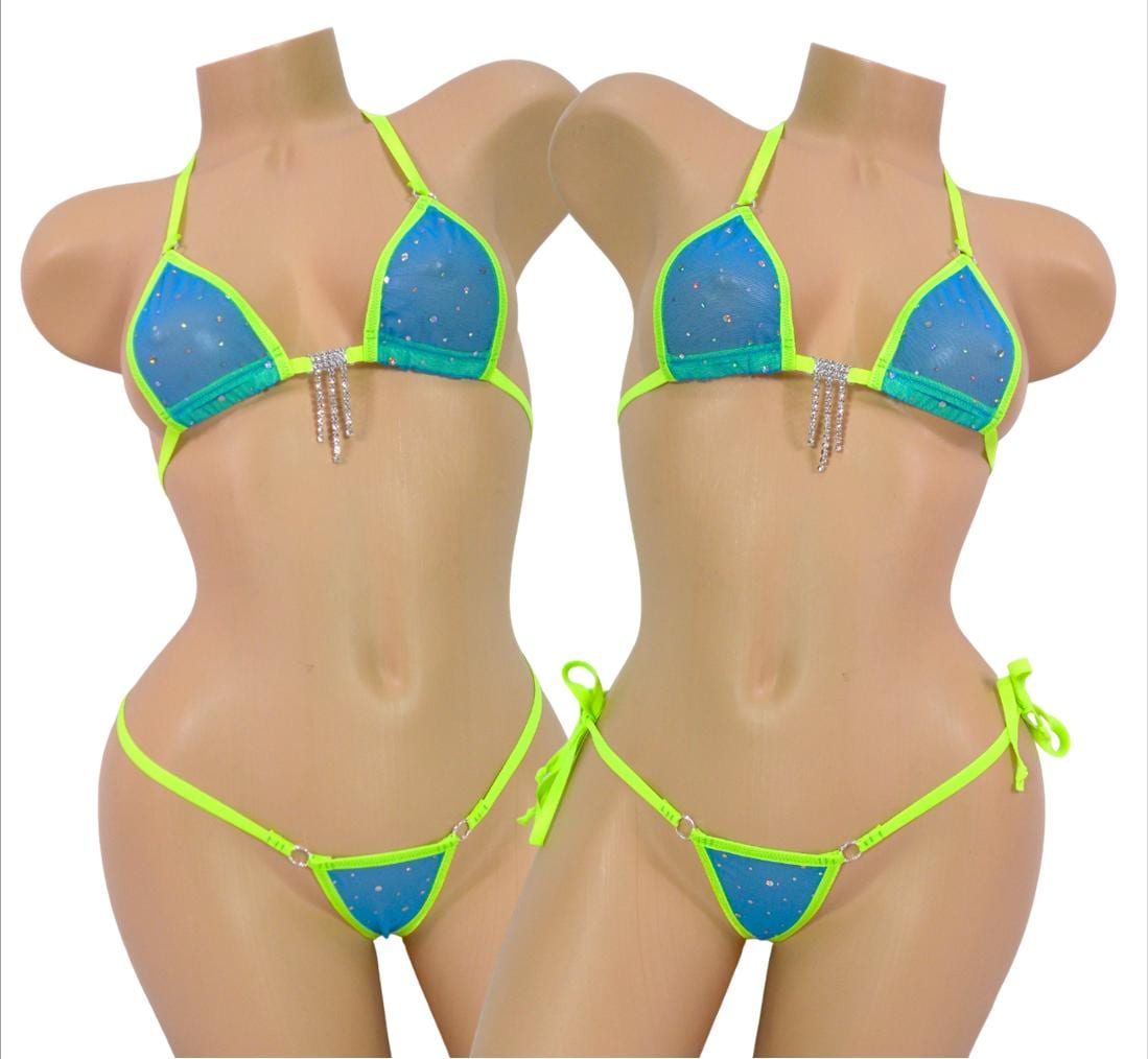 This extremely sexy bikini is made using a blue stretch mesh with holographic silver sequins that is trimmed in neon green. For that extra sparkle there is a dangly rhinestone between the cups.