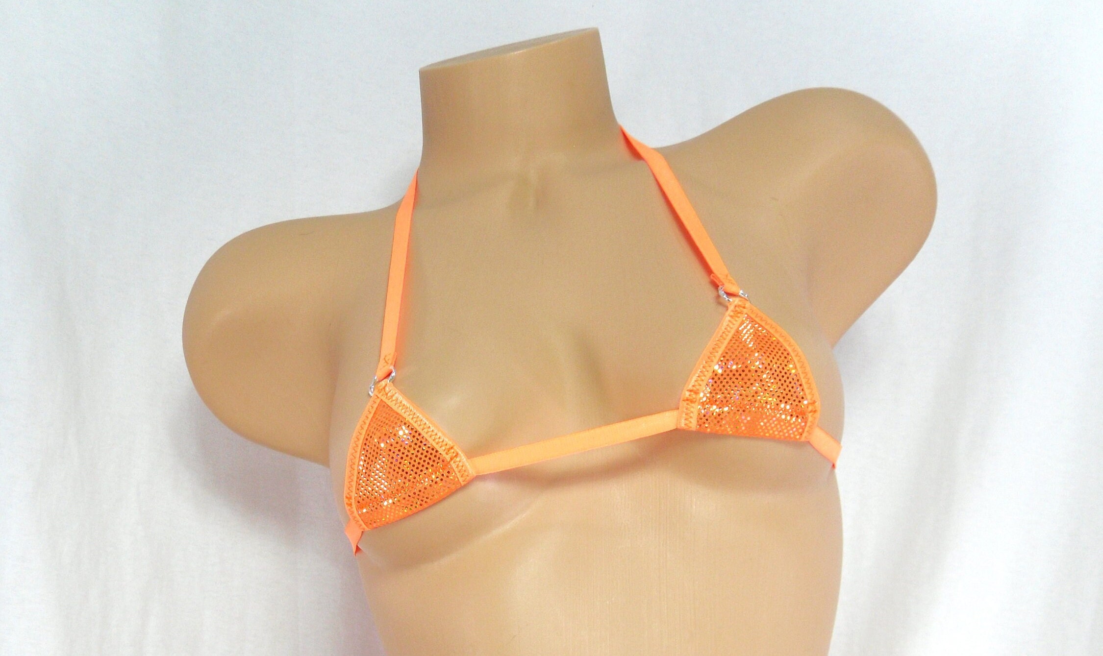 This extremely sexy bikini is made using an orange shattered glass holographic with gold holographic dots and is trimmed in neon orange.