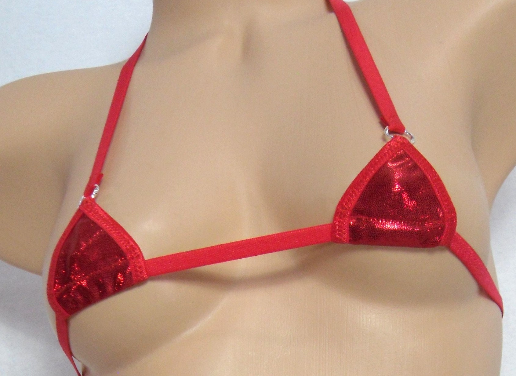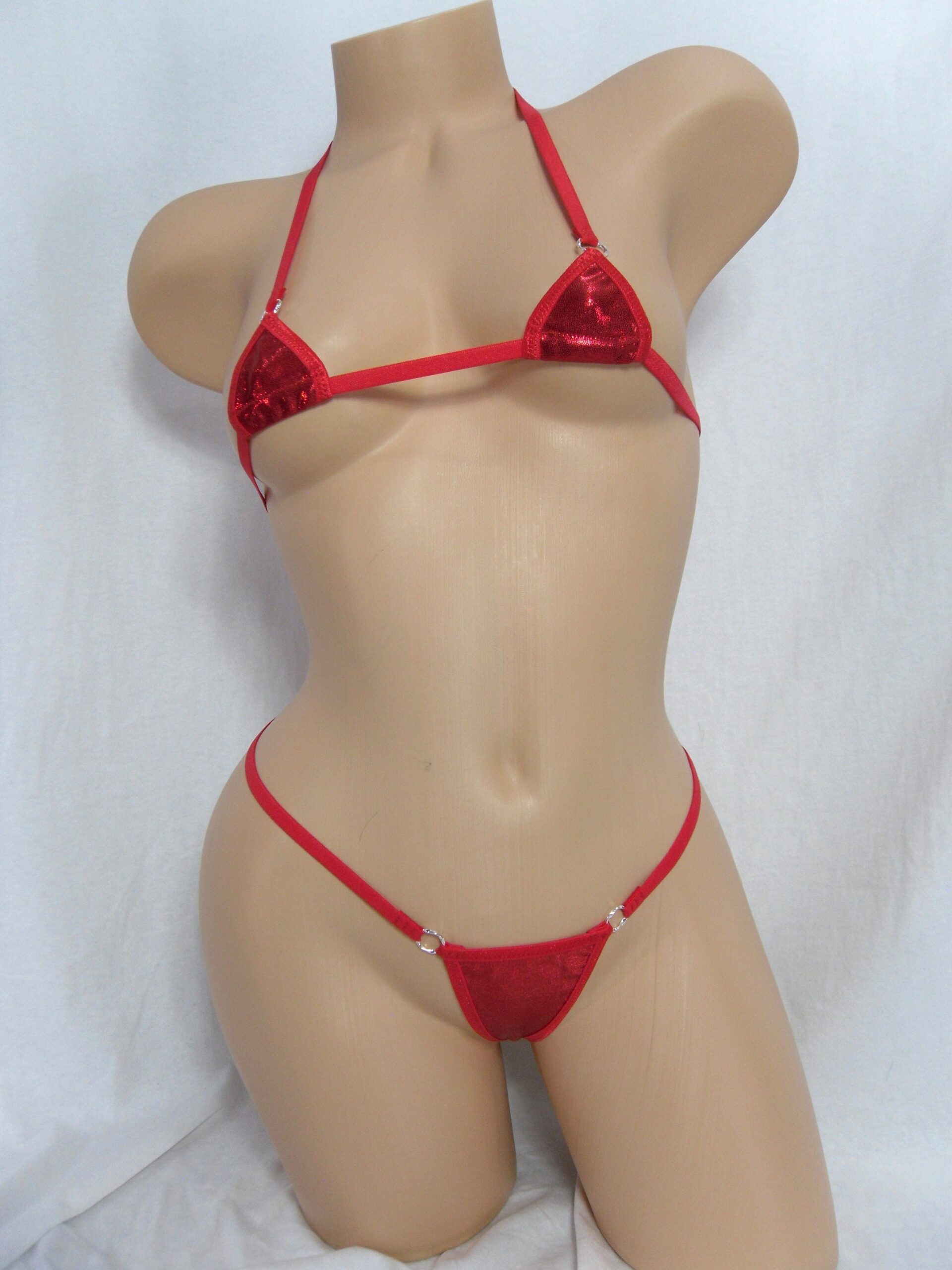 This extremely sexy bikini is made using a red mystique spandex with tiny metallic red dots and is trimmed in red.