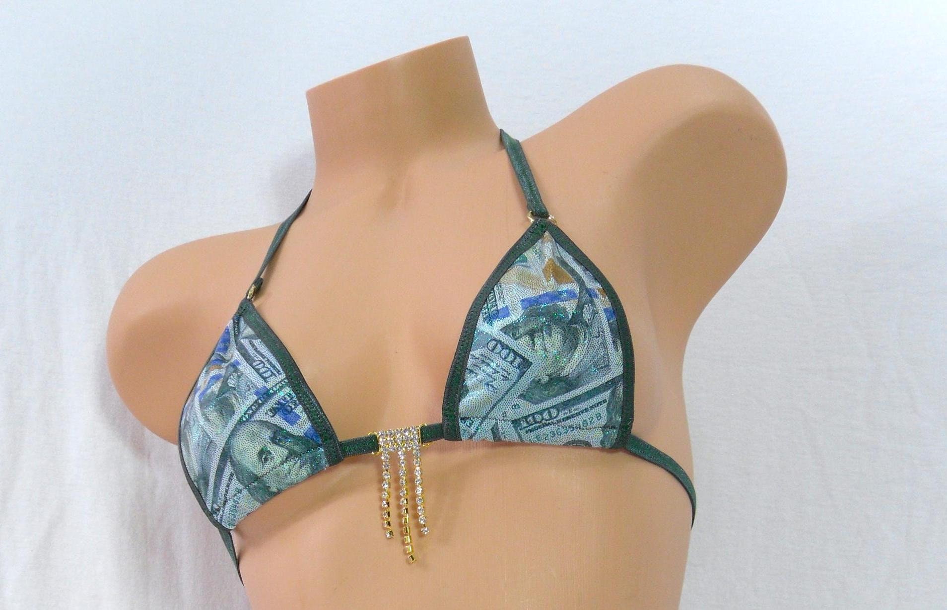 This extremely sexy bikini is made using a blue/green $100.00 bill money printed spandex with metallic blue/green tiny dots that is trimmed in army green. For that extra sparkle there is a gold dangly rhinestone between the cups.