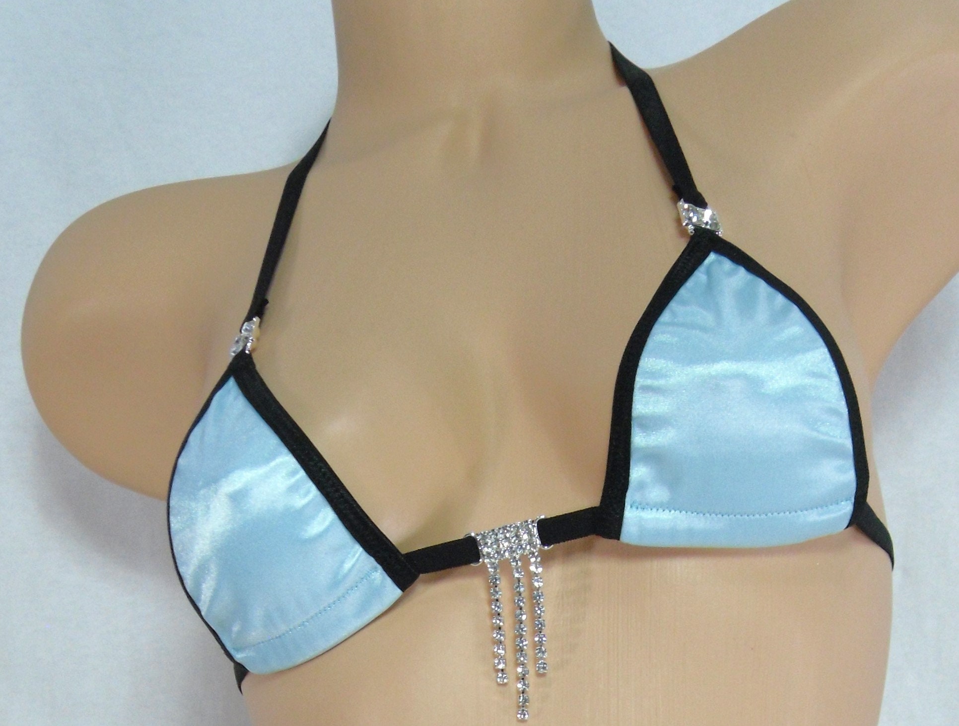 Baby blue satin with black trim and RHINESTONES!