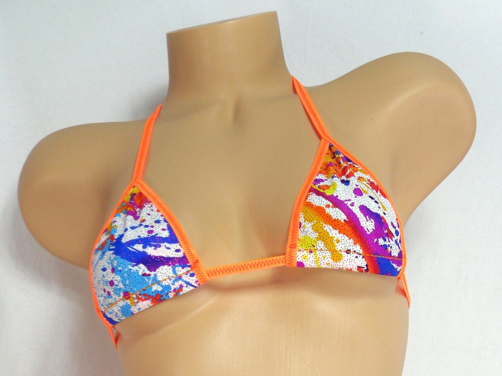 This extremely sexy bikini is made with paint splatter printed spandex with tiny holographic dots and is trimmed in neon orange.
