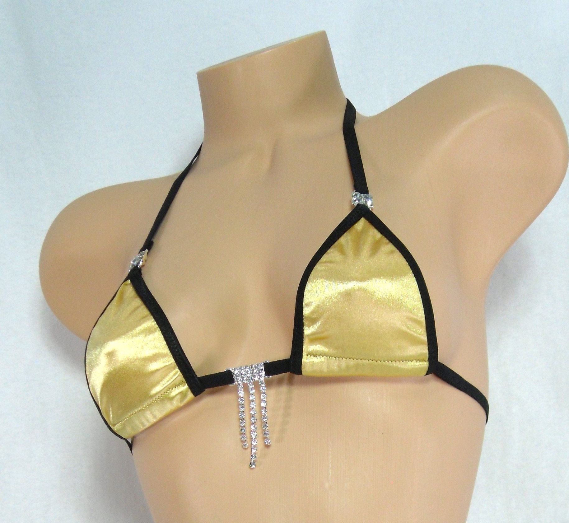This sexy bikini is make with a gold stretch satin that has been trimmed in black. Rhinestones are at the top of each cup with a dangly rhinestone between the cups for that extra sparkle. Rhinestones are also on each side of the G-string and one in the back.