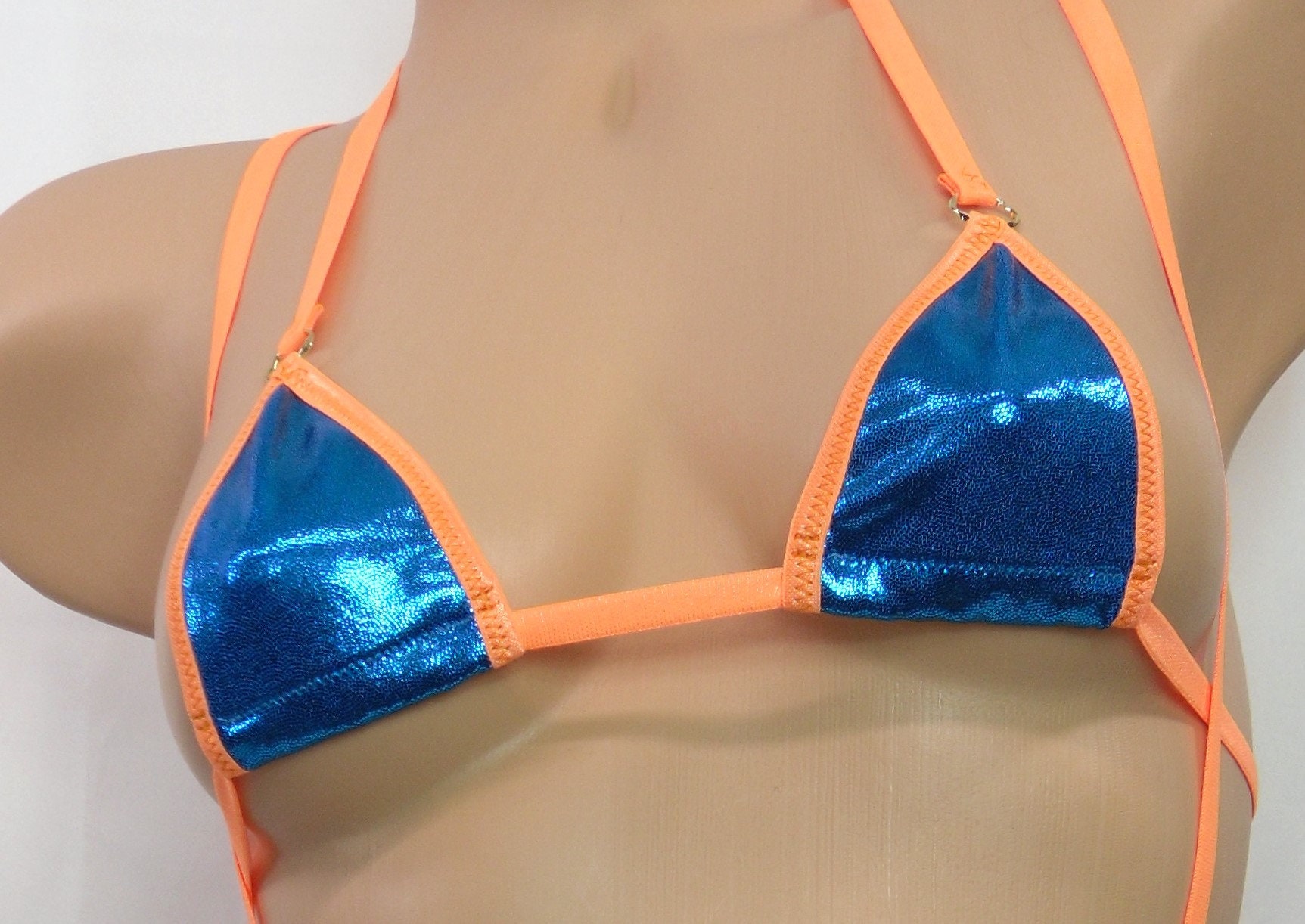 This extremely sexy bikini is made with an ocean blue mystique with tiny metallic blue dots and is trimmed in neon orange. There are gold metal rings attaching the straps to both the top and bottom.