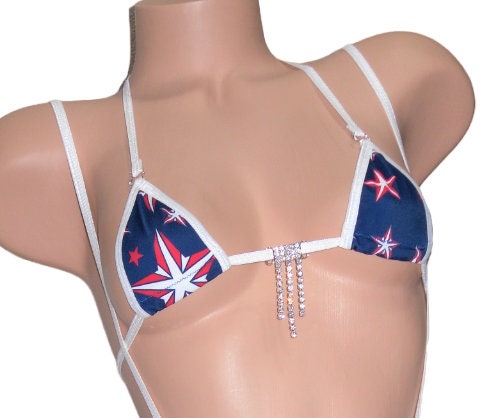 This extremely sexy bikini is made with a printed spandex of red and white stars on a navy background and is trimmed in white. For that extra sparkle there is a silver rhinestone between the cups.