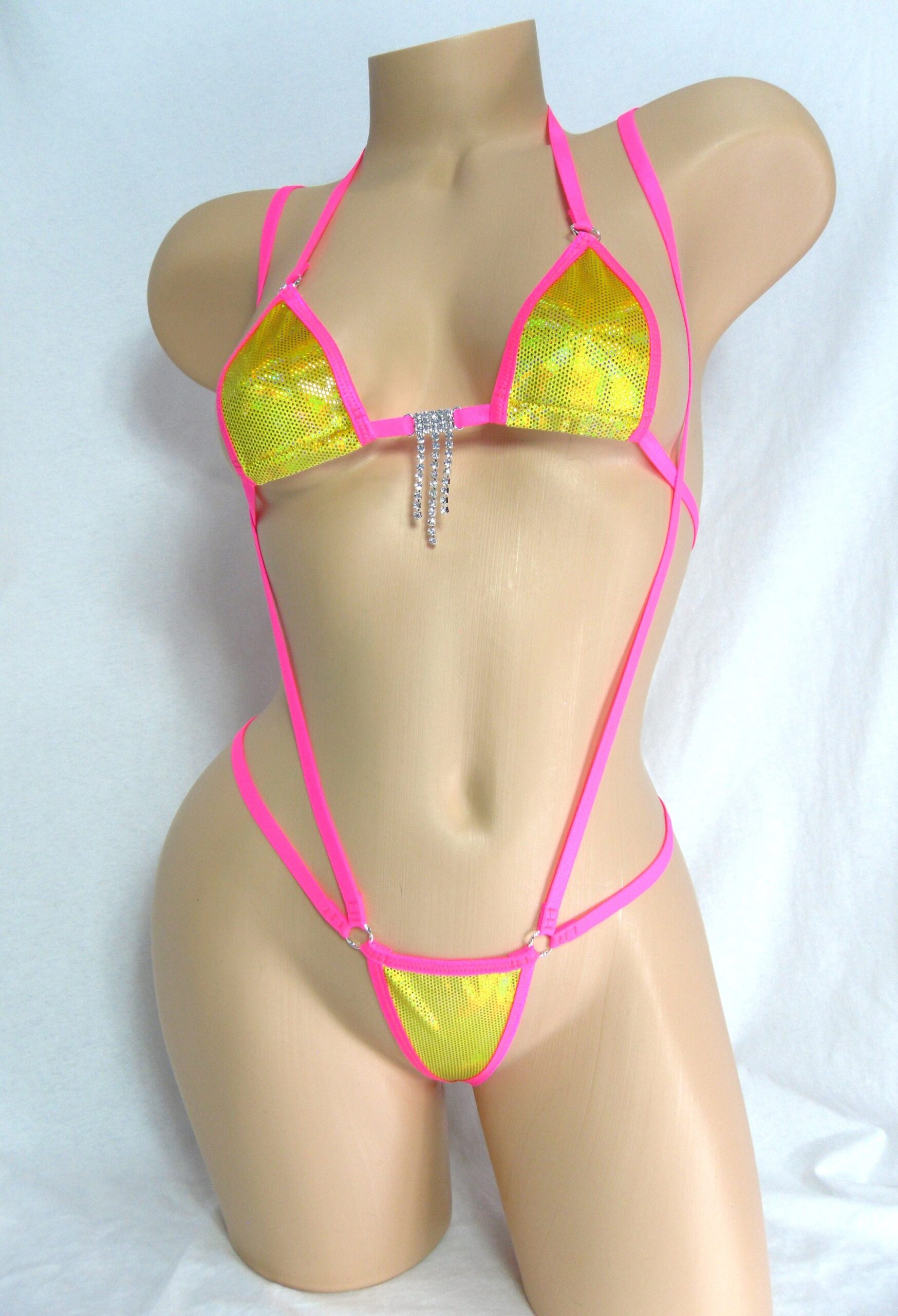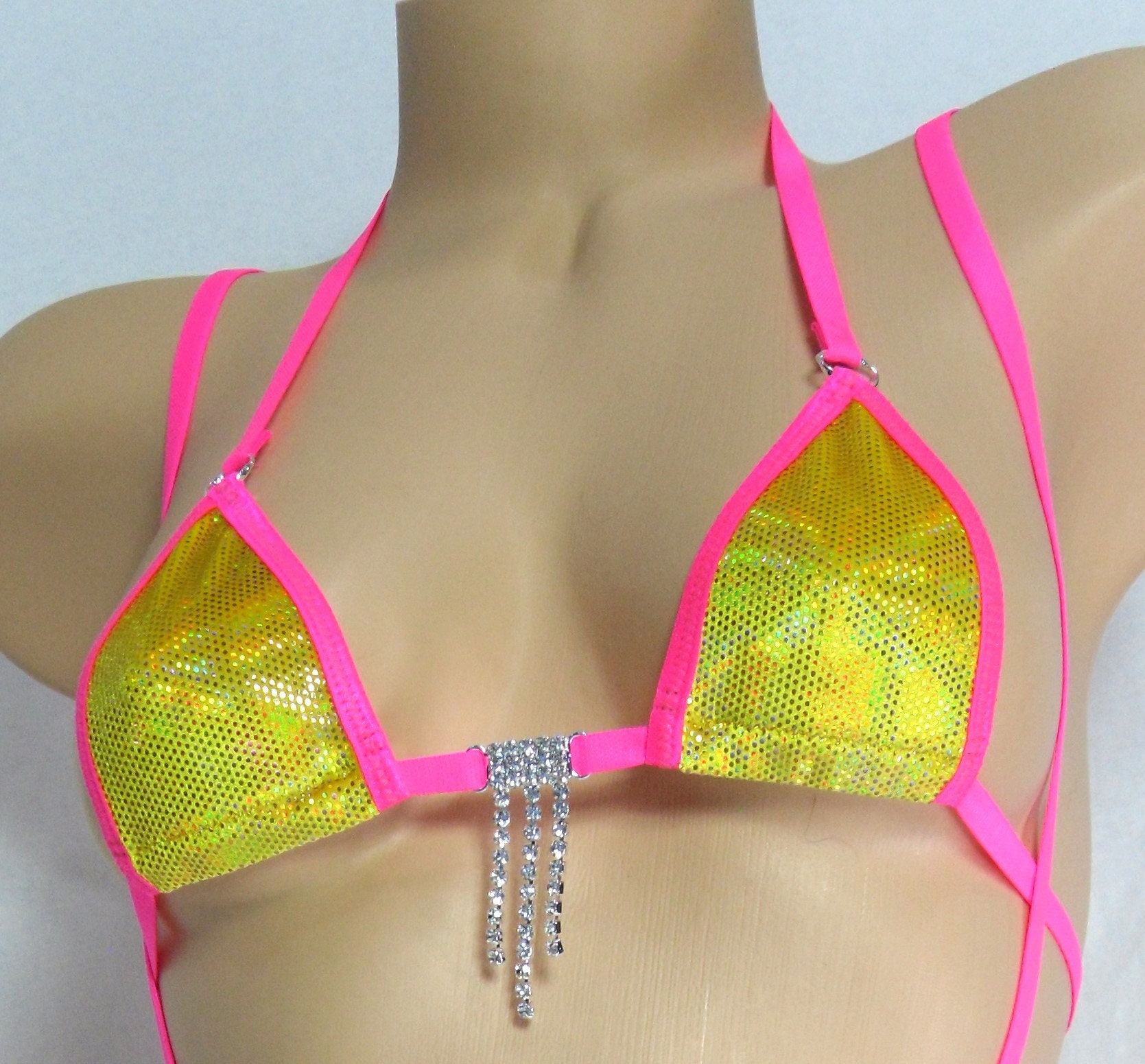 This extremely sexy bikini is made using a yellow/gold holographic stretch velvet that is trimmed in hot pink. For that extra sparkle there is a dangly rhinestone between the cups and metal rings on both the top and bottom attaching the straps.