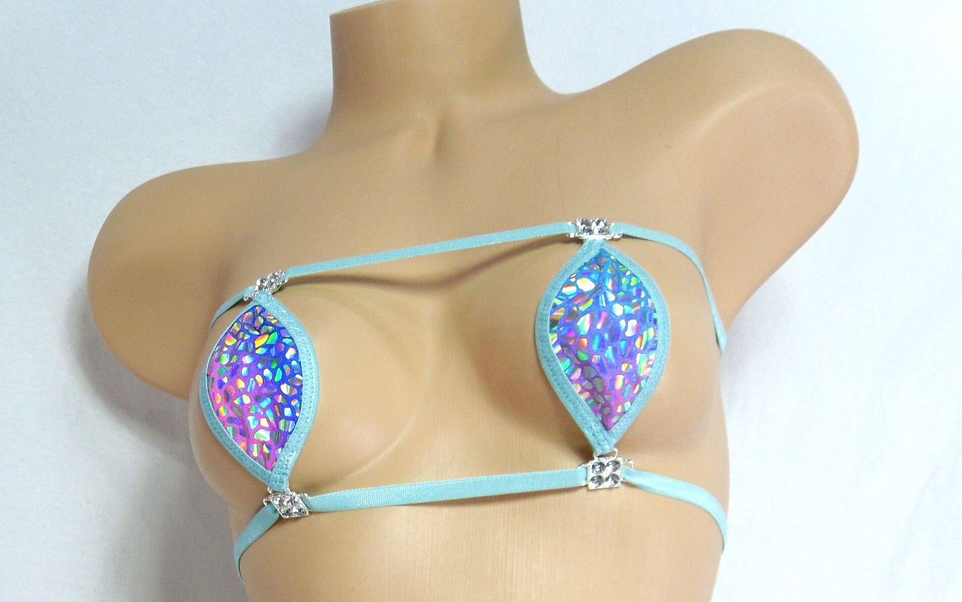 This extremely sexy bikini is made using pink, purple and blue tie dye spandex with sequins and turquoise trim.