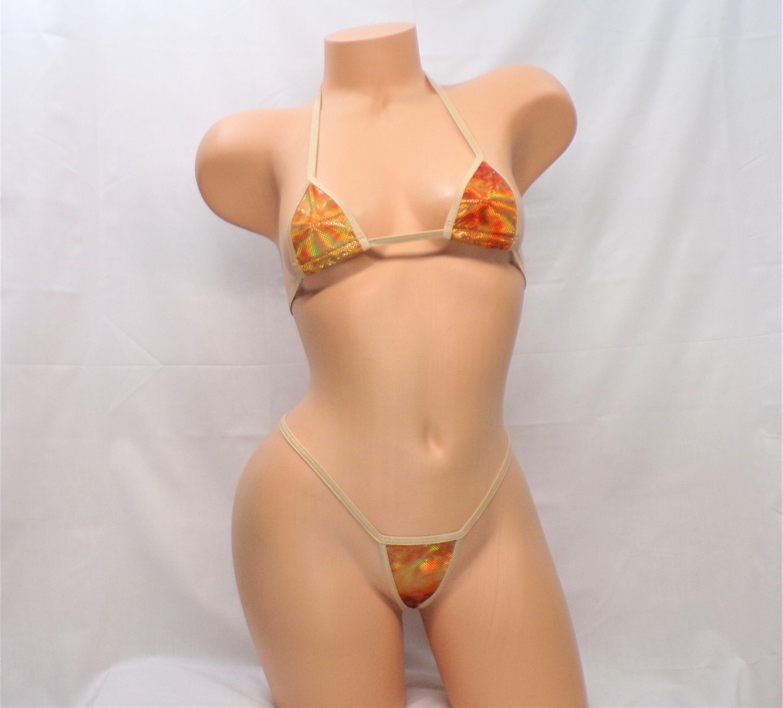 Be the first to review “Orange/Gold Holographic Tie-Dye Mini Micro Bikini with G-String in Nude Trim S/M”
