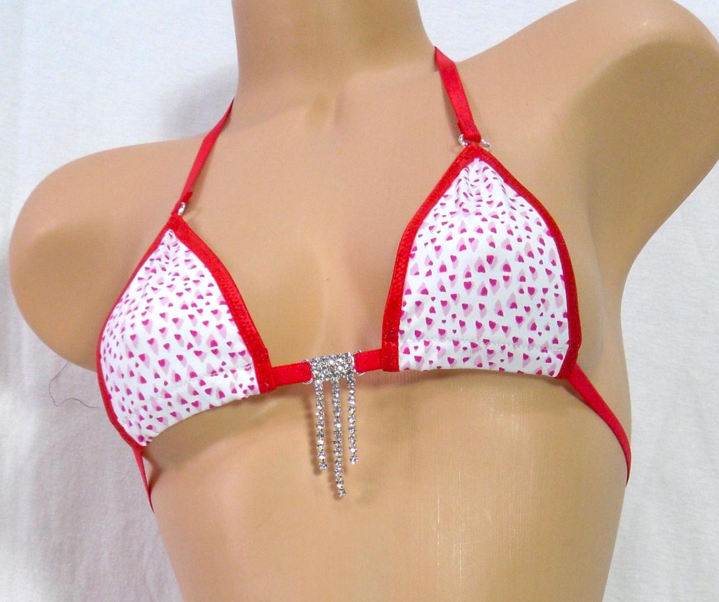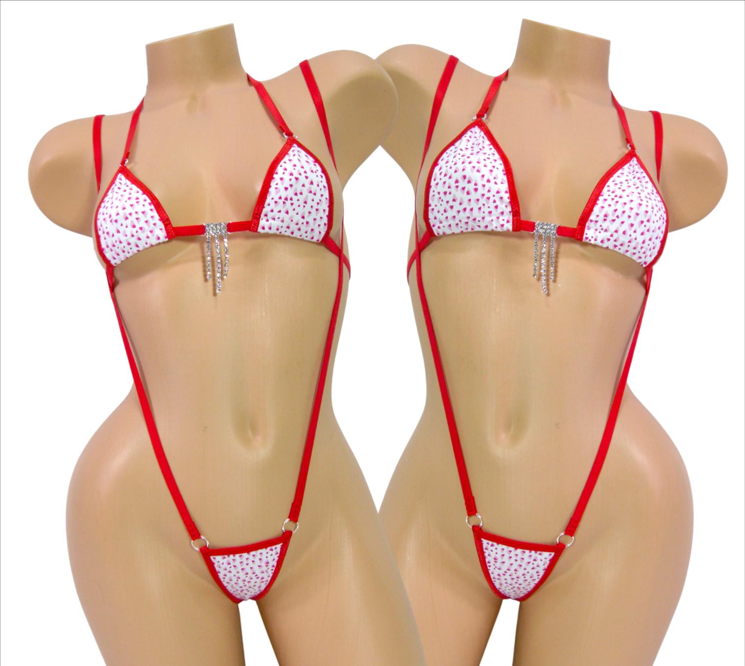 This extremely sexy bikini is made using a white spandex with tiny light and medium pink hearts and is trimmed in red. For that extra sparkle there is a dangly rhinestone between the cups.